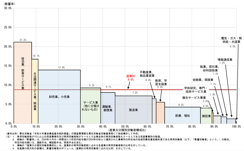 図表2の通り、従業員5人以上の事業所において「最低賃金の影響を受ける労働者」(最低賃金を改正した後に、改正後の最低賃金を下回る労働者)の割合は、2014年には3.6%でしたが、2024年には8.8%となり、過去10年間で約2.4倍となっています。