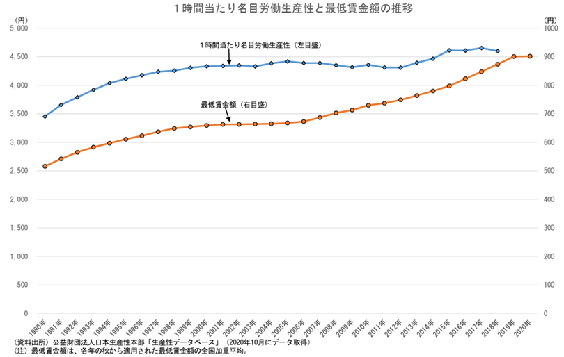 図表4.1時間あたり労働生産性と最低賃金の推移