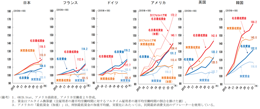 図表5.主要国の賃金・最低賃金(名目・実質)の推移
