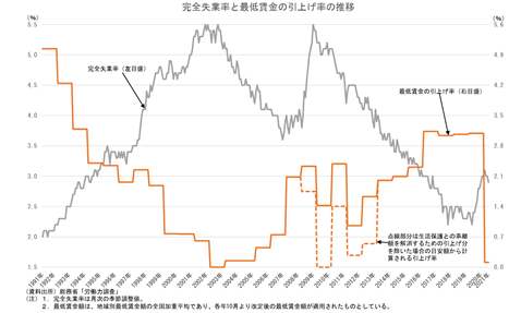 完全失業率が比較的高い時期には最低賃金引上げ率は低く、逆に完全失業率が比較的低い時期には最低賃金引上げ率が高くなる傾向にあります。