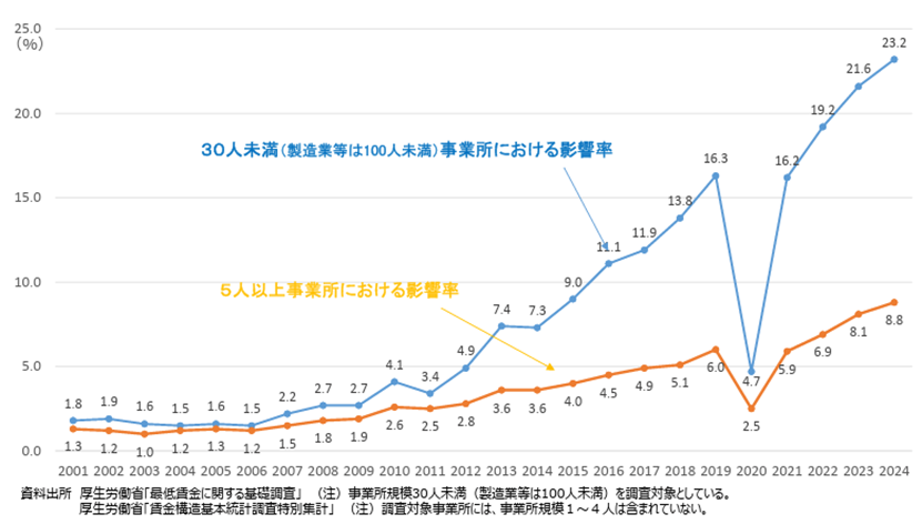 特に、従業員30人未満(製造業等は100人未満)の事業所では、2014年には7.3%だったものが2024年には23.2%となり、労働者の約4分の1が影響を受ける状況となっています。