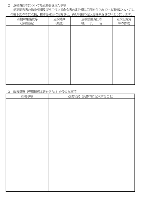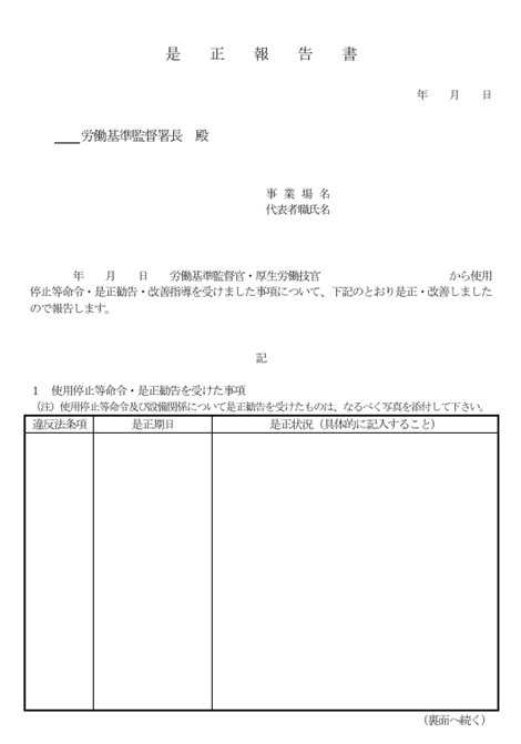 後に記載する是正報告書の様式からも、その違いが確認できます。いずれにしても、労働基準監督官が、違反と判断したり、改善が必要であると判断しているものですので、真摯な対応が必要です。