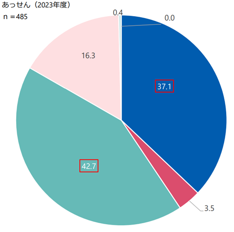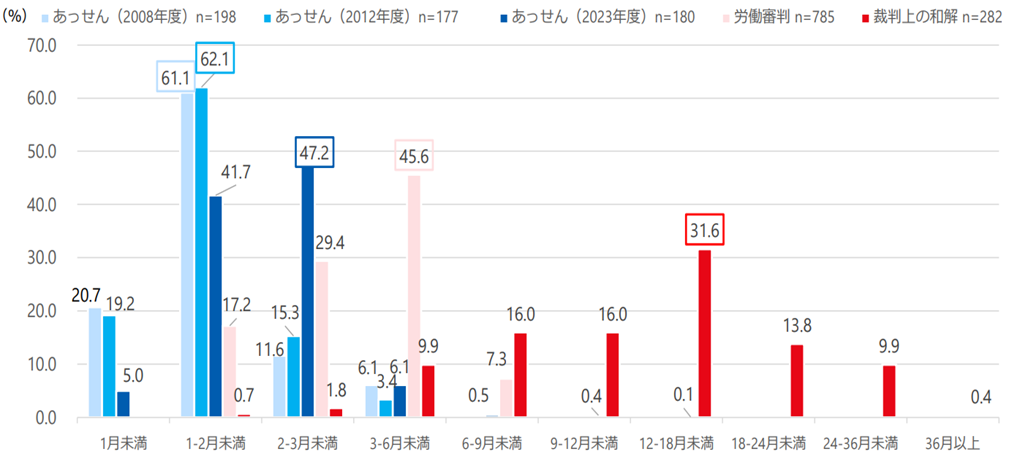 あっせんの合意成立事案における利用期間は、2023年度は「2〜3ヶ月未満」が最多となり、過去(1〜2ヶ月未満が最多)と比較してやや長期化の傾向が見られます。中央値は2.05ヶ月です。ただし、労働審判(3.12ヶ月)や裁判上の和解(12.63ヶ月)の中央値と比較すると、依然として極めて短期間での決着となっています。