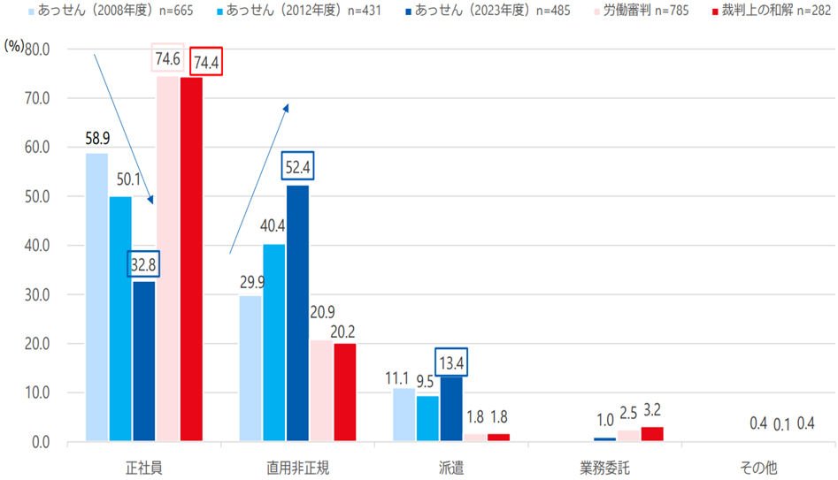 雇用形態についても変化が顕著で、正社員の比率が大幅に下がる一方、非正規労働者が上昇し、2023年度には正社員が3分の1、非正規が3分の2と逆転しています。なお、労働審判や裁判上の和解では、現在も約4分の3を正社員が占めています。