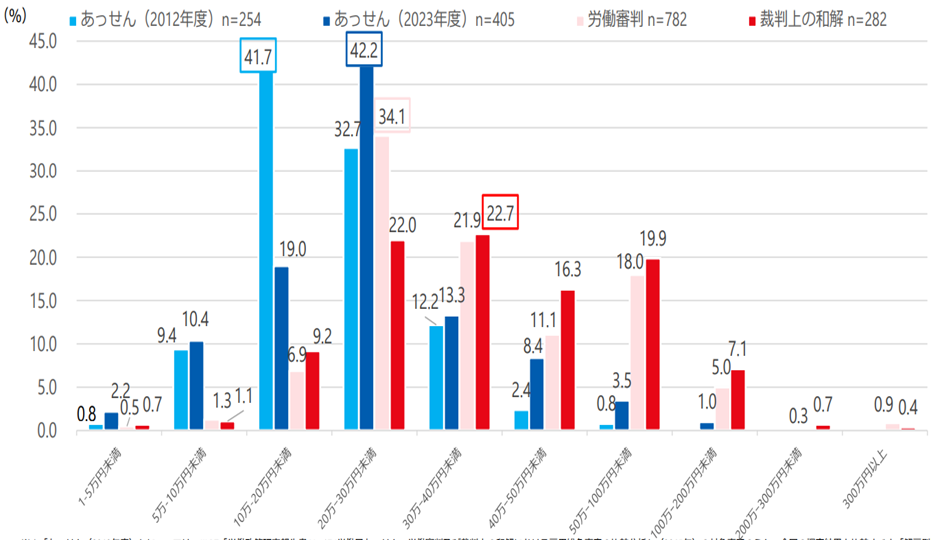 また、賃金月額は「20〜30万円未満」が約4割で最多となり、中央値は23.0万円と上昇傾向にあります。ただし、労働審判(中央値:32.0万円)や裁判上の和解(同37.0万円)の利用者層に比べると低い分布となっています。