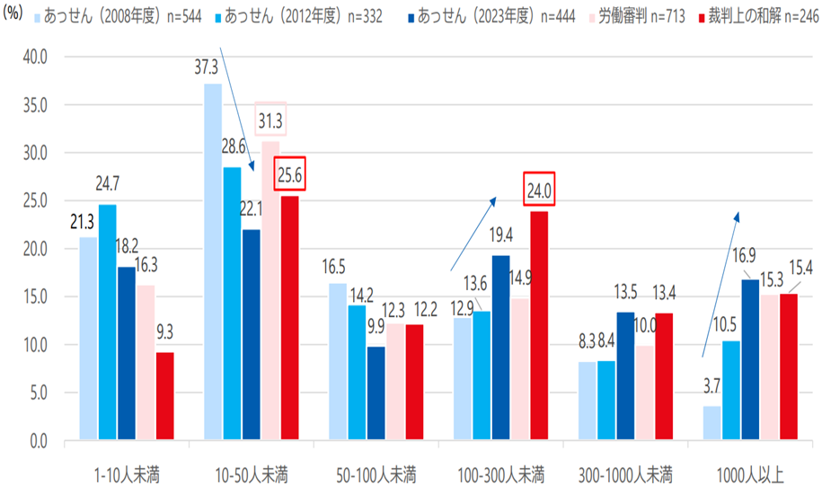 本調査では、解雇や雇止めといった雇用終了をめぐる紛争(485件)について、過去に行われたあっせん調査(2008年、2012年調査)と比較しながら、利用者の属性や解決内容の動向を分析することで、裁判によらない紛争解決の実態を明らかにしています。