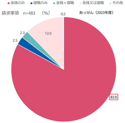 請求事項は、「金銭のみ」が83.0%で最多です。実際の解決内容において「復職」となったケースはわずか1.1%であり、これは労働審判(0.8%)や裁判上の和解(1.1%)と共通して極めて低い水準です。