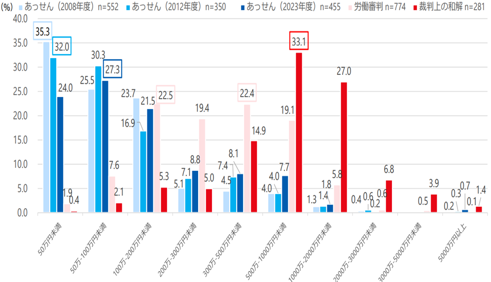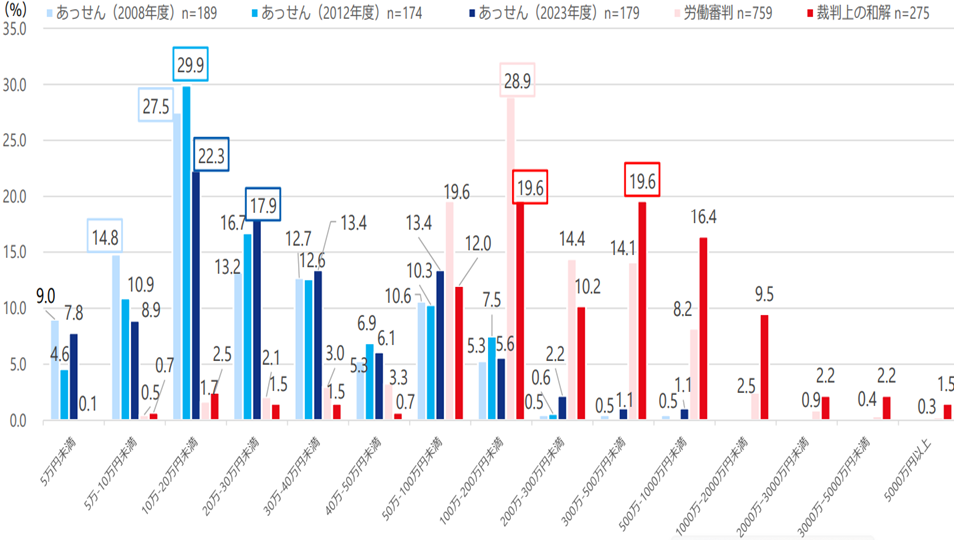 あっせんの請求金額は「50〜100万円未満」が最多(中央値90.3万円)ですが、実際の解決金額の中央値は23.5万円です。これを月収表示で見ると「1ヶ月分未満」が最多層であり、5ヶ月分未満までで9割を超えます。労働審判(解決金中央値150.0万円・約4.7ヶ月分)や裁判上の和解(同300.0万円・約7.3ヶ月分)と比較すると、金額面では著しい低水準にあります。