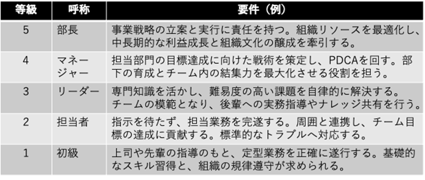 組織における「役職(ポスト)に期待される役割」でランク付けする制度です(図表4)。新卒(あるいは未経験者)から部長や本部長までを役職(に求める役割)の違いにより複数の等級に区分します。