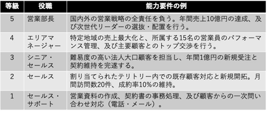 | <例> 職能資格制度:高度なマーケティング知識を有している。 役割等級制度:マーケティングの専門性を活かし、新規顧客開拓をリードしている。 |