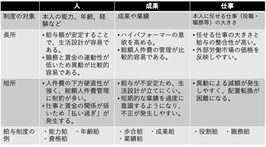 「メンバーシップ型か、ジョブ型か」という議論はよく耳にしますが、ここでは制度の本質をより分かりやすく整理するために、「人」「成果」「仕事」の3つの基準で整理してみます(図表1)。