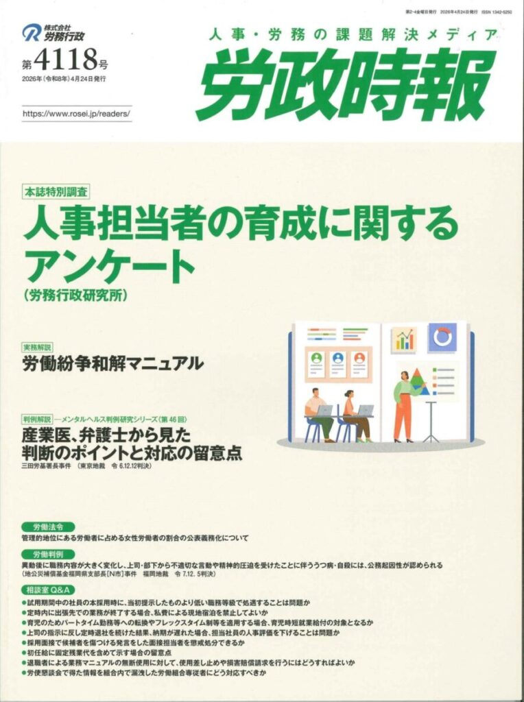 株式会社労務行政が発行する「労政時報 第4118号」の「相談室Q&A」にIPO事業部マネージャーの 木村の記事が掲載されました。